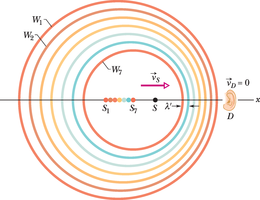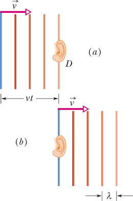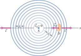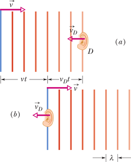 Kujutleme korraks olukorda, kus detektor on paigal (joonis 17-20). Aja t jooksul liiguvad lainefrondid vahemaa vt võrra paremale. Lõigul asuvad kõik need lainefrondid, mis on läbinud detektorit aja jooksul, ja nende arv on seega vt/λ. Kiirus, millega detektor registreerib lainefronte, on ühtlasi ka detektori poolt registreeritud sagedus