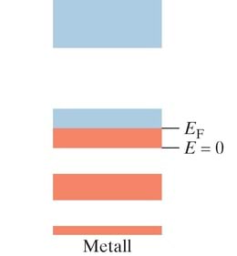 Metalle iseloomustab asjaolu, et kõrgemad täidetud energianivood ulatuvad energiatsooni keskpaigani, nagu näidatud joonisel 41-5. Kui nüüd rakendada metalli otstele potentsiaalide vahe, tekib vool, sest sealsamas tsoonis kõrgematel energiatel on olemas hulk vakantseid nivoosid, kuhu elektronid (ehk laengukandjad metallis) saavad hüpata. Seega saab metall juhtida elektrit tänu asjaolule, et kõrgeimas täidetud tsoonis asuvatel elektronidel on soodne võimalus kõrgematele energianivoodele liikuda.