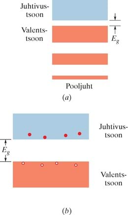 Kui võrdlete joonist 41-9a joonisega 41-4, siis näete, et pooljuhi tsoonistruktuur on sarnane isolaatori omaga. Peamine erinevus on selles, et pooljuhil on kõrgeima täidetud tsooni (nimetatud valentstsooniks) lae ja selle kohal oleva vakantse tsooni põhja vahel (nimetatud juhtivustsooniks) palju väiksem keelutsooni laius . Seega pole kahtlust, et räni () on pooljuht ja teemant () on isolaator. Ränis – aga mitte teemandis – on reaalne võimalus, et soojusliikumine toatemperatuuril kutsub esile elektronide hüppe valentstsoonist juhtivustsooni.