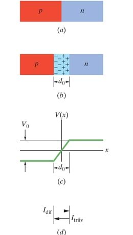 Sel moel moodustavad läbi siirdepinna paremalt vasakule difundeeruvad elektronid ruumlaengu mõlemal pool siirdepinda (joonis 41-12b). Augud, difundeerudes läbi siirdepinna vasakult paremale, tekitavad täpselt samasuguse efekti. (Võtke endale aega selles veendumiseks.) Nii tekitavad elektronid ja augud kaks ruumlaengu piirkonda – ühe positiivse ja teise negatiivse. Need kaks piirkonda moodustavad tõkkekihi paksusega (joonis 41-12b).