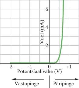 Vaadake nüüd joonist 41-13. See näitab, et kui tekitame potentsiaalide vahe siirde pärisuunas, s.t rakendame siirdele päripinge, siis tekib vool läbi siirde. Kui aga muudame potentsiaalide vahe suuna vastupidiseks – rakendame vastupinge, siis vool läbi siirde praktiliselt kaob.