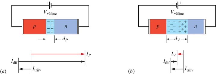 Enamuslaengukandjad (elektronid n-poolel ja augud ppoolel) difundeeruvad läbi siirdepinna, tekitades difusioonvoolu .