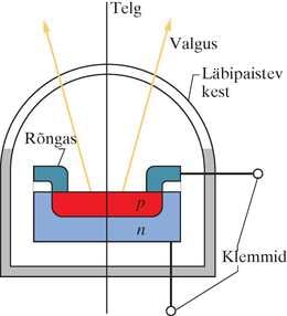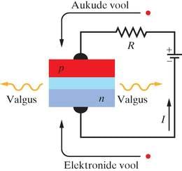 Mida meil vaja läheb, on pooljuhtmaterjal väga suure elektronide arvuga juhtivustsoonis ja vastava arvu aukudega valentstsoonis. Niisuguse omadusega seadist saab valmistada, kui rakendada tugevalt dopeeritud -siirdele suurt päripinget, nagu näidatud joonisel 41-16. Siis toimib vool läbi seadme -tüüpi aines elektrone lisavalt ja -tüüpi aines auke lisavalt. Kui dopeering on küllalt tugev ja ka vool küllalt suur, siis võib tõkkekiht muutuda väga õhukeseks, võib-olla vaid mõne mikromeetri paksuseks. Tulemuseks on väga suur elektronide tihedus -tüüpi materjalis vastakuti samuti väga suure aukude tihedusega -tüüpi materjalis, vahel üksnes kitsas tõkkekiht. Nüüd saab toimuda palju elektron-auk-rekombinatsioone, mis tekitab valguskiirguse sellest piirkonnast. Joonisel 41-17 on näidatud tegeliku LEDi ehitus.