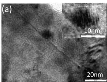 | Joonis 2.3.3.a Elektronide difraktsioon on oluline kvantmehaanika eksperiment, sellega seoses on arutatud kvantmehaanilise maailmapildi veidruse üle ja pakutud välja mitmeid mõttelisi katseid. Lisaks sellele on elektronide difraktsioon ka hea vaatlusvahend. Näiteks õhuke vase ja tsingi sulfiidi kiht, mida kasutatakse päikesepaneelides paistab elektronmikroskoobis üsna uduselt | Joonis 2.3.3.b Läbivate elektronide difraktsioon ei anna küll kihist otsest pilti, aga sellest saab välja lugeda aine struktuuri, aatomite paigutuse. |
