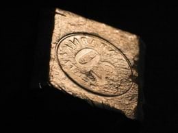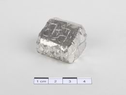 Keemiline element indium (In), tetragonaalne kristallstruktuur.