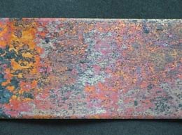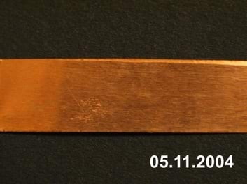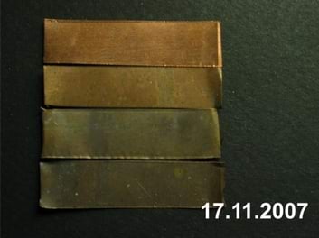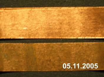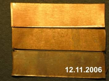 Aasta välitingimustes hoitud vaskplekk (alumine riba) võrdluses sisetingimustes (suletud plastikaatkotis) hoitud vaskplekiga (ülemine riba).
