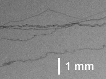 Peenimate vasksilikaattorukeste läbimõõt on oluliselt väiksem kui 0.1 mm (must-valge foto, suurendatud kontrast, 90° pööratud).