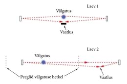 Lihtsaim viis seda väidet kontrollida on osa valgust tagasi peegeldada. Oletame, et suurel kaugusel ühest laevast on paigaldatud kaks peeglit, liikumissuuna suhtes ette ja taha. Kui välked jõuavad mõlemalt peeglilt laeva tagasi samaaegselt, peab ta olema kera keskpunktis. Sealsed vaatlejad võivad tõestuseks kiirkatikuga kaamera abil teha isegi foto, mis näitab kummagi peegelduse üheaegsust. Paraku ei lahenda see väitlust põhjusel, mida näitab joonis 9-2.