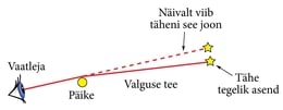 Saime selgeks, et ruumi kõverus Maa lähedal on liiga väike, et avaldada mõõdetavat mõju valguskiirtele. Päikese gravitatsiooniväli on tublisti tugevam, vähemalt tema läheduses. Joonis 12-4 näitab, mis juhtub tähe näiva asendiga, kui tema valgus peab Päikesest lähedalt mööduma, et meieni jõuda.