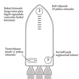 Oleme nüüd valmis üle selgitama segadust astronaudiga kaksikute paradoksis. Joonisel 12-3 on kiirenev rakett, mille ninas on kell, mis saadab kümme korda sekundis ajasignaale, mida raketi sabas vastu võetakse.