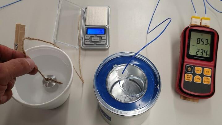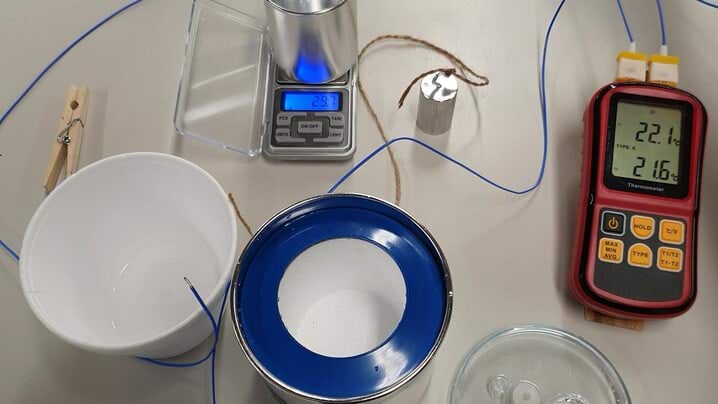 Carefully lift the test piece from one container to another. However, this should be done quickly enough so that it does not cool down. The temperature of the cold water can be measured after the test object has completely cooled (it takes time for the heat to reach the water from the test object, so the temperatures of the test object and the water in the calorimeter equalize).