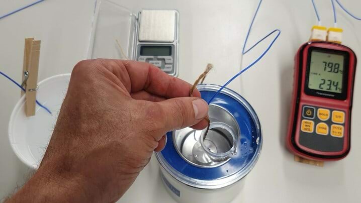 Place the thermometers according to the situation shown in the photo in a larger cup with hot water and in the calorimeter. When heating the test object, you should stir the water from time to time and try to make it so that the test object is completely heated (because the heat takes time to spread to the center of the test object).
