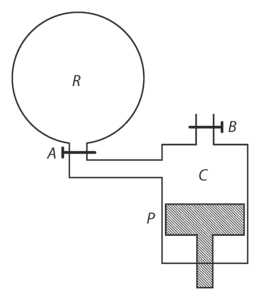 Guericke kasutatud pump oli väga lihtne. Selle tööpõhimõte on näidatud joonisel 5. Tühjakspumbatav nõu on ühendatud kraani abil silindriga , milles tihkelt liigub õlitatud nahaga kaetud kolb . Silindri ülemises osas on kraan . -st õhu väljapumpamisel suletakse kõigepealt kraan , avatakse kraan ja viiakse üles kolb ; siis suletakse , avatakse ning kolb lastakse alla. Nüüd läheb osa õhku nõust nõusse , järelikult rõhk nõus langeb. Siis suletakse jälle , avatakse , viiakse üles kolb ja kogu tsükkel kordub. Kuna kolb pandi liikuma hambulise lati ja hammasratta abil, siis võib arvata, et rõhu alandamine keras atmosfäärirõhuga võrreldes küllalt väikeseks oli kauakestev ja väsitav.