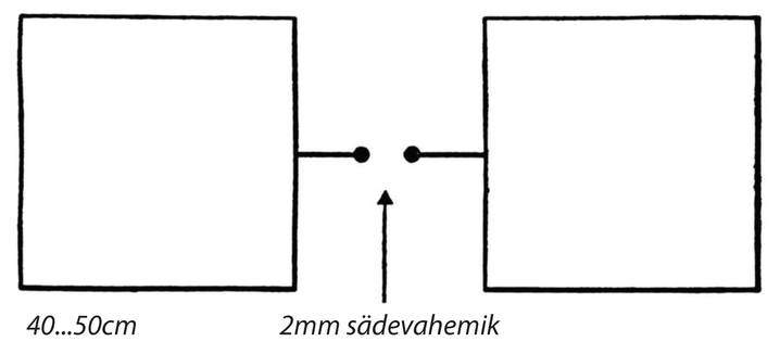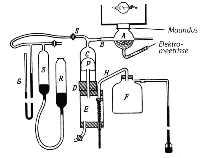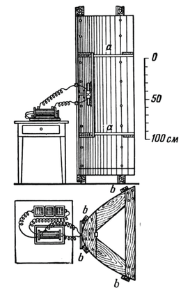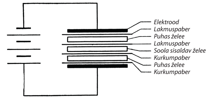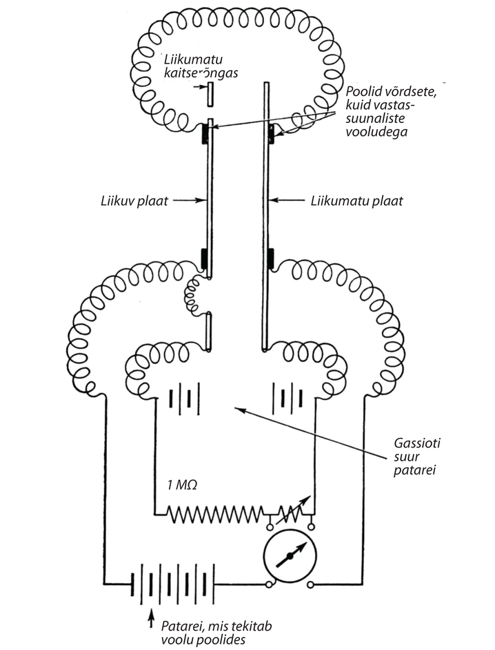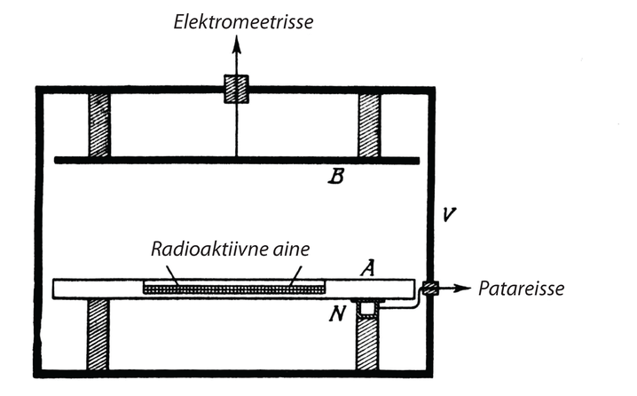 Nende kasutatud seadme skeem on joonisel 46. See seade koosneb kahest 8cm läbimõõduga metallkettast ja , mis asuvad teineteisest kaugusel ja mille vahel tekitati ligi -voldine potentsiaalide vahe. Kiirgav aine kanti ühtlase kihina alumisele plaadile. Ahelasse lülitatud tundlik galvanomeeter näitas mõne aja möödudes küllastusvoolu suurusjärgus .