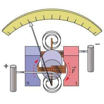 Vooluga raamile mõjub magnetväljas jõud ja voolutugevust saab mõõta magnetväljas vooluga raamile mõjuva jõu kaudu (joonis 1.3.). Raami vastaskülgedele mõjuvad jõud pööravad seda päripäeva. Raami külge pannakse osuti ja jõu tasakaalustamiseks spiraalvedrud.