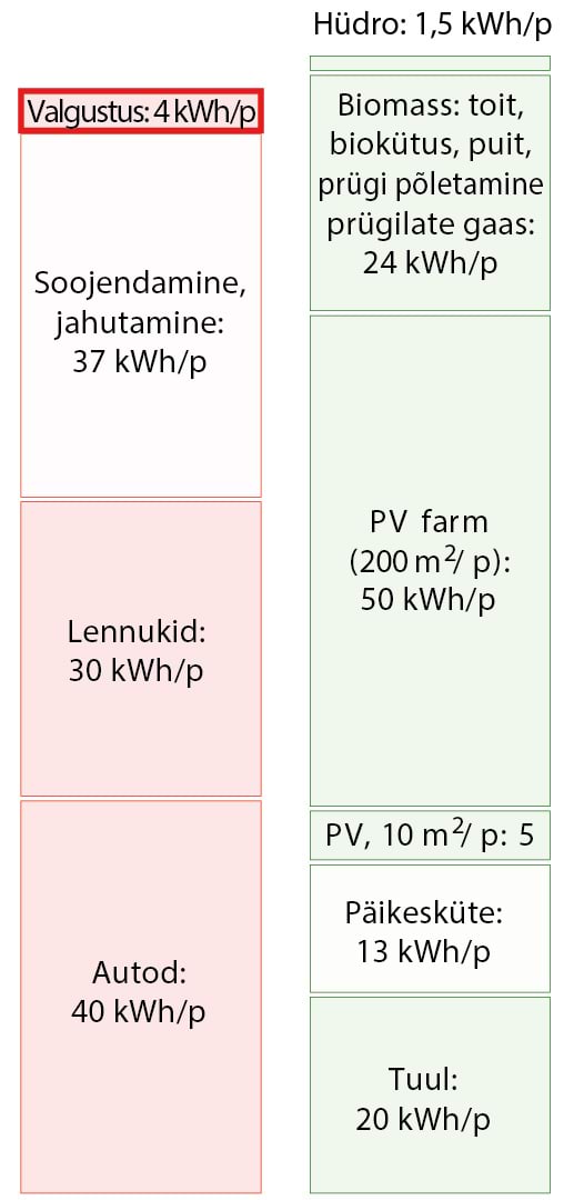Kui kasutatakse numbreid, muudab nende suurus need tihtipeale hägusaks. Numbreid kasutatakse mulje avaldamiseks, sõnasõjas punktide võitmiseks, teavitamata jätmiseks. Minu eesmärk on seevastu tuua välja ausad faktidel põhinevad numbrid nii, et need oleks arusaadavad, võrreldavad ja meeldejäävad. Need numbrid on muudetud arusaadavaks sellega, et on väljendatud igapäevastes personaalsetes ühikutes. Energiat väljendatakse kilovatt-tundides () elaniku kohta, samades ühikutes, mida võib näha tavalisel elektriarvel; ja võimsust kilovatt-tundides päeva kohta (kWh/p), samuti ühe elaniku kohta. Joonisel 2 on näitena võrreldud mõningaid suurusi neis ühikutes. Punases tulbas (tarbimine) on näidatud, et kui sõita tavalise autoga päevas , kulutab see päevaga energiat. Paremal pool, rohelises tulbas (tootmine), on välja toodud mõned taastuvad energiaallikad: kui katta riigi territooriumist tuuleparkidega, toodaks see päevas elaniku kohta elektrienergiat.