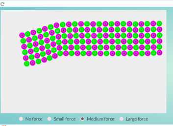 | Kuidas muutub tahke aine aineosakeste soojusliikumine, kui ainele temperatuuri tõsta? | Selles arvutisimulatsioonis saad muuta aine temperatuuri ning aineosakeste omavahelise tõmbejõu suurust ja iseloomu. Muutke neid parameetreid ja uurige, mis juhtub. Pane tähele, et simulatsioonis puudub gravitatsioon, mistõttu moodustab vedel aine tilga, mitte ei vaju alla. |