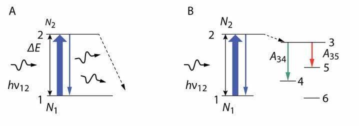 Olgu nüüd tegemist mitmenivooliste aatomite kogumiga, Jn 11.6B, kus aatomid ergastatakse (≡pumbatakse) nivoole footonite abil. Selle seisundi hõive väheneb nii kiirguslike ülemineminekute kui ka põrgetest põhjustatud üleminekute tulemusena. Nivoolt toimuvaid madalama sagedusega f<f21 kiirguslikke üleminekuid nimetatakse Stokesi üleminekuteks. On võimalik ka anti-Stokesi üleminek näiteks nivoole ja siis f<f21 . Kui ülemineku eluiga on suhteliselt lühike, nt , siis räägitakse fluorestsentskiirgusest, sekunditesse ja minutitesse ulatuvate eluigade puhul on tegemist luminesentsiga.