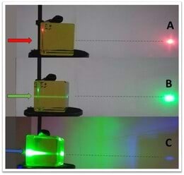 Joonise Jn 11.7 fotod demonstreerivad hajumise, ergastamise ja neeldumise sõltuvust fluorestseeruvale keskkonnale langeva valguse lainepikkusest , tekkinud pildid on seletatavad joonise Jn 11.6 baasil. Punane laserikiir ei ergasta, ei neeldu ega ka haju märgatavalt. Kuna hajunud valguse intensiivsus , siis lühema lainepikkusega rohelise laseri valgus hajub juba märgatavalt, kiir on nähtav ka külgsuunas, kuid märgatavat neeldumist ja ergastamist ei toimu. Sinise laseri valgus hajub tugevasti ja ergastab ka kristalli molekulid kõrgemale energianivoole, kus toimuvate üleminekute tulemusena kiiratakse pikemalaineline roheline valgus, mis on nähtav läbi kristalli külgseina.Nende protsesside tõttu laserikiire intensiivsus kahaneb oluliselt.