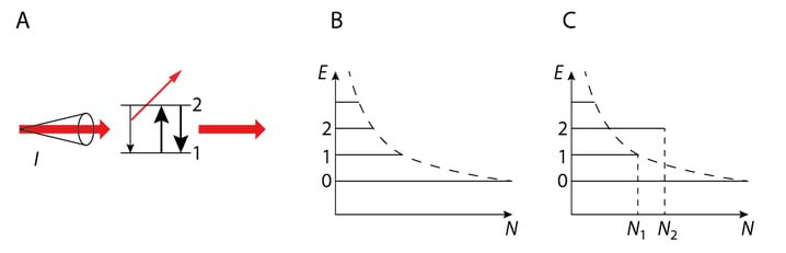 (K 11.11) Näeme, et sõltuvalt hõivete vahest võib af olla nii positiivne kui ka negatiivne. Negatiivne af tähendab, et ainekihi läbimisel valguse intensiivsus kasvab. Tasakaalulises olukorras on nivood hõivatud vastavalt Boltzmanni jaotusele, Jn11.9B, st alati ja domineerib neeldumine. Valguse intensiivsus ainekihi läbimisel kasvab, kui tekitada mingil viisil pöördhõive st , Jn 11.9C.