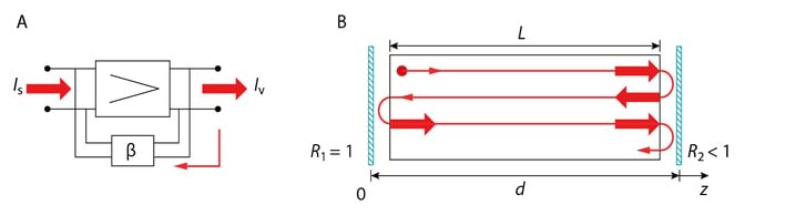 Tagasiside loomiseks optilise diapasooni generaatorites (≡ laserites) paigutatakse aktiivkeskkond peeglite vahele, Jn 11.11B. Generatsiooni tekke tingimus v11.16 omandab nüüd kuju