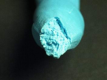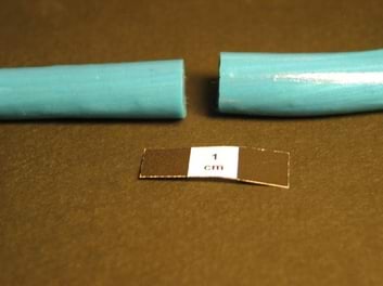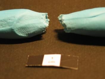Võrdlusena samasuguse plastiliiinist silindri katkemiskoht ja -pind. Täheldatav on “kael” ja rebendi pinna äärmiselt ebakorrapärane struktuur.