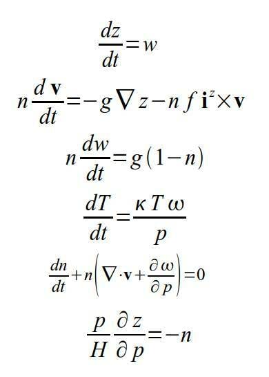 Füüsikat eristab teistest loodusteadustest kõige ulatuslikum matemaatiliste meetodite rakendumine. Pildil on adiabaatiline täielik mittehüdrostaatiline hüdrodünaamika võrrandite süsteem rõhukoordinaatides. Selle süsteemi mõnedel lihtsustatud variantidel toimib olulisel määral tänapäeva ilmaennustus ja kliima modelleerimine. Jah, võrrandisüsteem on keeruline ja annab mõnikord ebatäpseid tulemusi, aga ta on olemas!