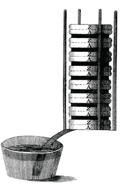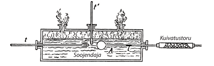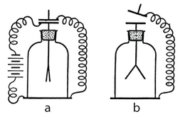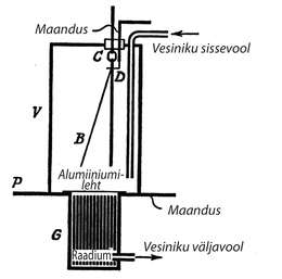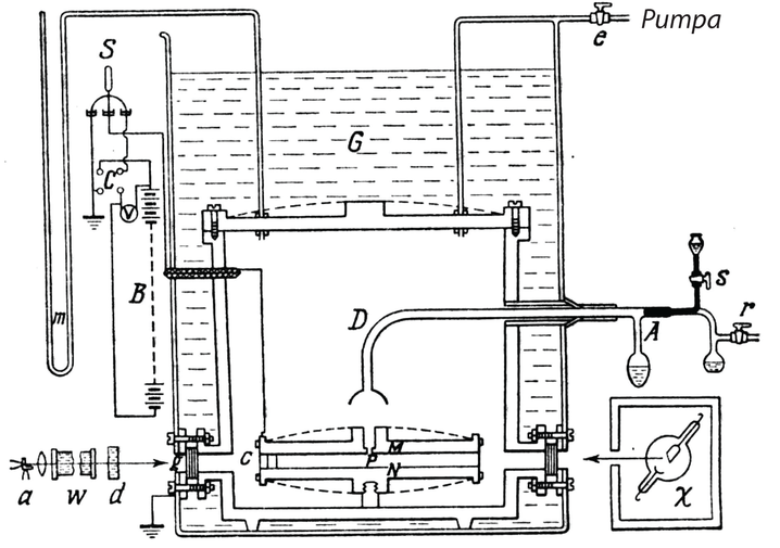 Nende kasutatud seadme skeem on joonisel 46. See seade koosneb kahest 8cm läbimõõduga metallkettast ja , mis asuvad teineteisest kaugusel ja mille vahel tekitati ligi -voldine potentsiaalide vahe. Kiirgav aine kanti ühtlase kihina alumisele plaadile. Ahelasse lülitatud tundlik galvanomeeter näitas mõne aja möödudes küllastusvoolu suurusjärgus .