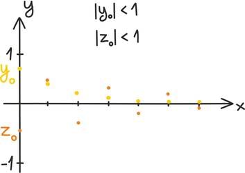 Oletame näiteks, et hakkame ühte arvu iseendaga korrutama. Kui selle arvu absoluutväärtus on suurem kui 1, satume nullist järjest kaugemale, kui aga arvu absoluutväärtus on 1-st väiksem, läheneme järjest nullile. Järgnevatel graafikutel oleme võtnud neli arvu x0, õ0,y0 ja z0 ja hakanud neid iseendaga korrutama. Kahe esimese absoluutväärtus on ühest suurem ning nii suunduvad iseendaga korrutamisel saadud arvud nullist järjest kaugemale. Kahe viimase absoluutväärtus on ühest väiksem ning nende korrutised koonduvad nulli suunas.