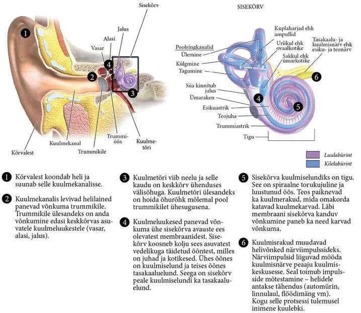 Inimese kõrv on kaugelt tundlikum ja täiuslikum, samas ka keerukam seade kui mistahes mikrofon. Selles veendumiseks piisab, kui uurida alljärgnevat joonist. Siinkohal saame anda vaid väga ligikaudse kirjelduse sellest, mismoodi me helisid kuuleme. Hoidke ja säästke oma kuulmist – liiga vali heli, üldse igasugused kiired rõhu muutused võivad seda kahjustada. Ja kord juba tekkinud kahju on väga keeruline parandada.