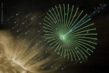 | Päikeselt purskunud laetud osakeste voog Päikeselt Maale. Maad kaitseb magnetväli, mis kallutab laetud osakesed kõrvale. Maa ümber on kujutatud Maa magnetosfääri. Sellest hoolimata jõuab osa laetud osakestest Maa magnetpooluste kaudu atmosfääri ja sellest tekivad virmalised. | Päikeselt purskunud laetud osakeste vood põhjustavad Maa atmosfääri jõudes virmalisi. |
