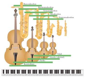 | Koeravile – inimesed seda ei kuule, kuna see tekitab ultraheli. | Saksofonide ja viiulite pered. Pildil on näidatud muusikariista pikkuse seos temast tuleva heliga. Iga muusikariista sagedusvahemik on tähistatud horisontaalse ribaga sageduste skaalal, milleks on kõige all asuv klaviatuur. Sagedus suureneb paremale poole. |