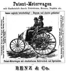 Neljataktilise sisepõlemismootori patenteeris 1860. aastal saksa leidur Christian Reithmann. Nicolaus August Otto asutas aastal 1864 esimese mootoritehase ja aastal 1876 ehitas -taktilise gaasil või piiritusel töötava mootori. Aastatel 1885–1886 ehitas ja patenteeris Carl Benz kolmerattalise auto, millel olid kõik tänapäevase auto põhiosad: neljataktiline mootor, väntvõll, elektrisüüde ja vesijahutus. Kütuseks oli toorbensiin – ligroiin, mida sai tol ajal osta apteegist. Henry Fordi konveiertootmisest alates on neljataktilise töötsükliga bensiinimootoriga autod siiani massilises kasutuses. Kõrvaloleval pildil on maailma esimene autode reklaamprospekt.