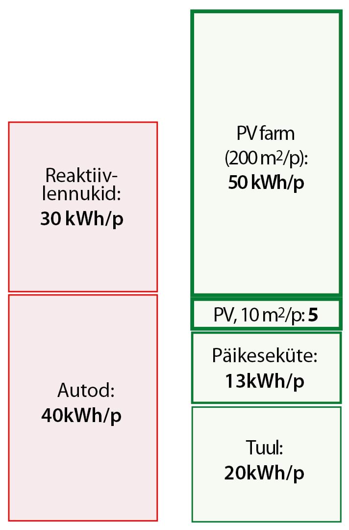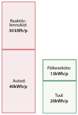 Veel üks meeldejääv arv on pikamaalendude panus inimese energeetilisse jalajälge. Kui te lendate kord aastas Kaplinna ja tagasi, kulutate selle reisiga sama palju energiat, kui kulub aasta läbi iga päev autoga sõitmisele.