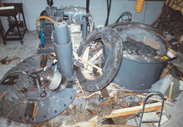 | Umbes 30 m läbimõõduga kraater, mis tekkis 14. aprillil 1970. a kokkupõrkel Kuuga. See asub Mare Cognitumist põhjas –2,55° laiuskraadil ja –27,88° pikkuskraadil. | Seismojaam Apollo 12 maandumiskohas Kuul. Seismograaf jälgib pinna liikumisi, registreerides seismilisi laineid. Vasakul paiknev mõõteseade on muutuva temperatuuri ja sellega kaasnevate soojuspingete eest kaitstud metallfooliumiga. |