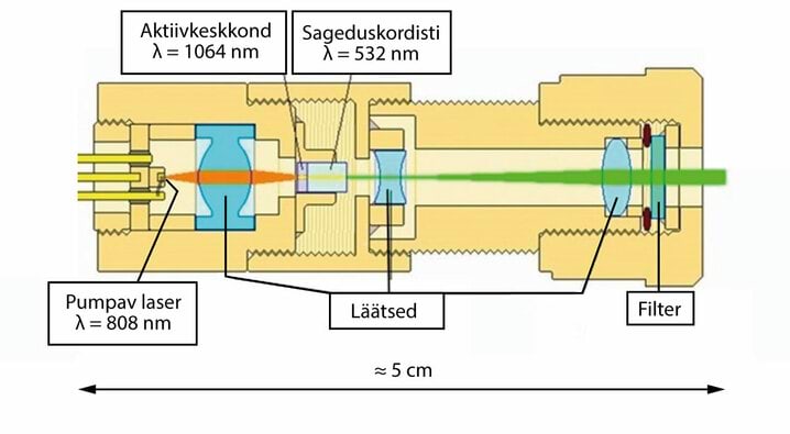 Jn 11.14 kujutatud laseris, λ=1064nm, toimuvad protsessid vastavad joonisel Jn 11.10 toodud nivoode skeemile. Pöördhõive aktiivkeskkonnas tekitatakse vasakul paikneva pooljuhtlaseriga, λ=808nm. Aktiivkeskkond koos sagedust kahekordistava kristalliga paikneb dikromaatsete peeglite (ei ole joonisel kujutatud) vahel, millest vasakpoolne laseb läbi lainepikkust λ=808nm ja peegeldab lainepikkust λ=1064nm ning parempoolne peegeldab lainepikkust λ=1064nm ja on läbipaistev lainepikkusel λ=532nm. Filter neelab valguse lainepikkusel λ=1064nm. Üle poole laserviiba pikkusest moodustavad laseri toiteks kasutatavad patareid.